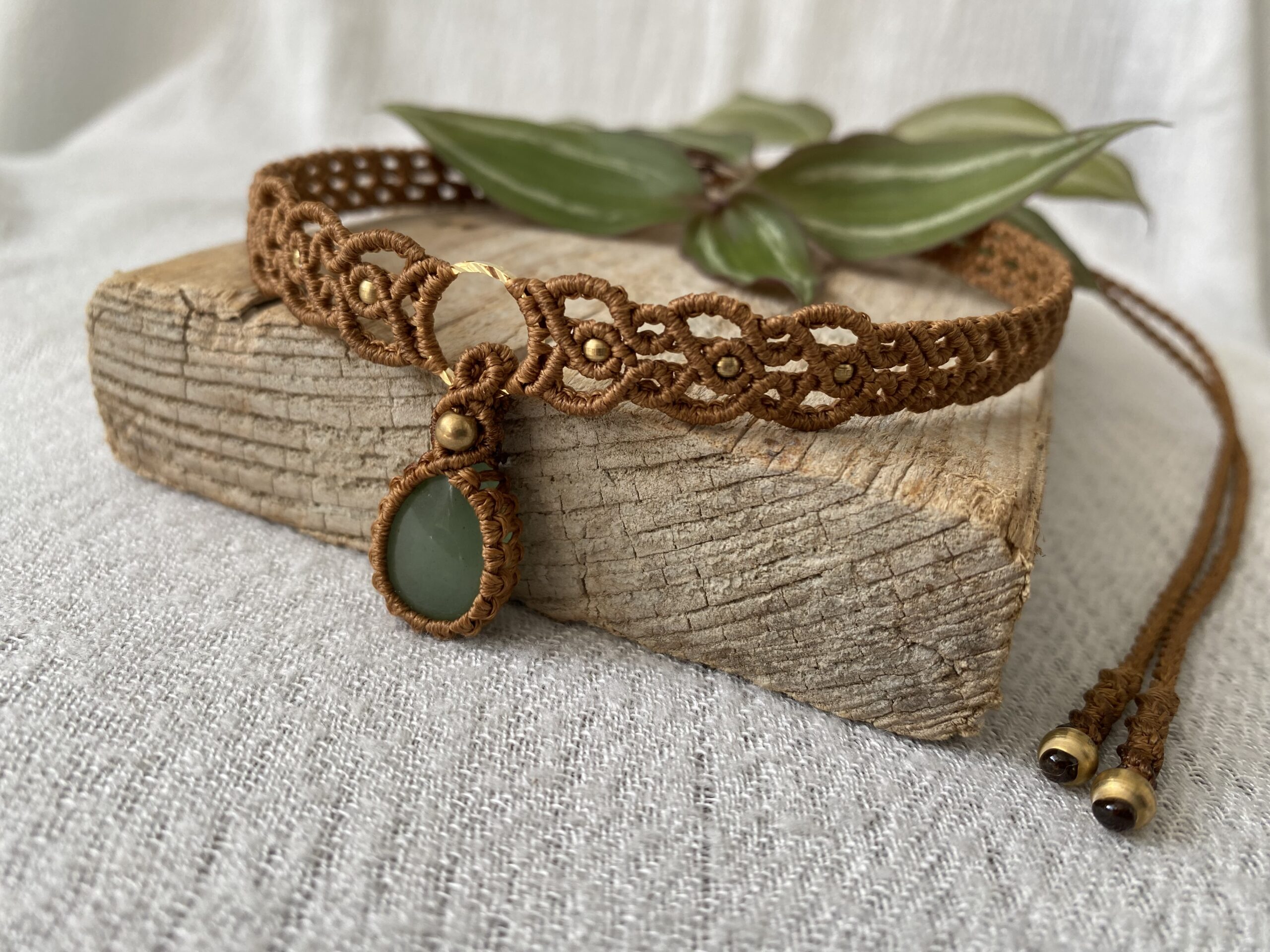 עשוי מחוטים איכותיים בגוון חום-קרמל, בשילוב חרוזי פליז קטנים שמעניקים לו מראה בוהמייני עדין ואלגנטי.