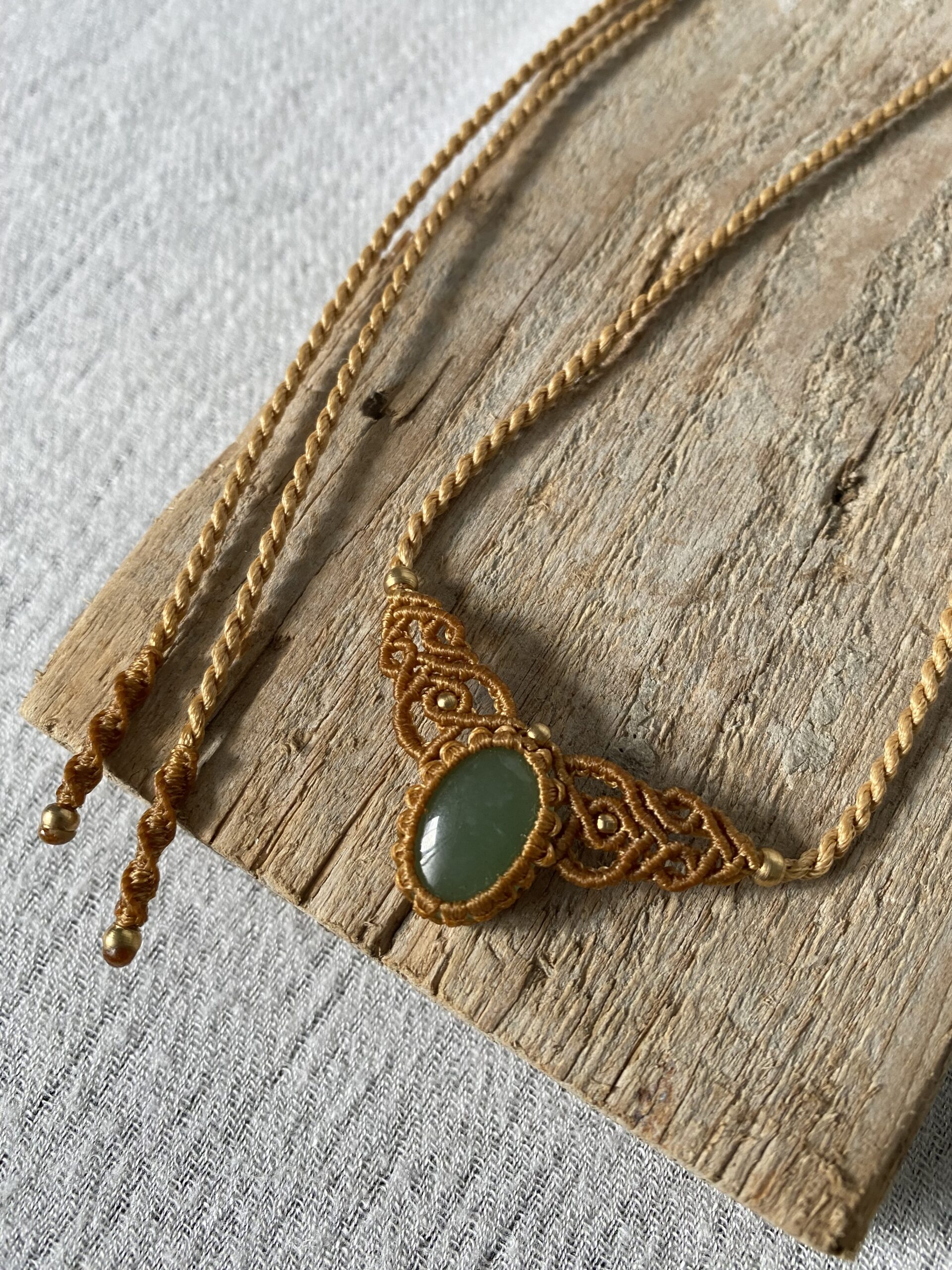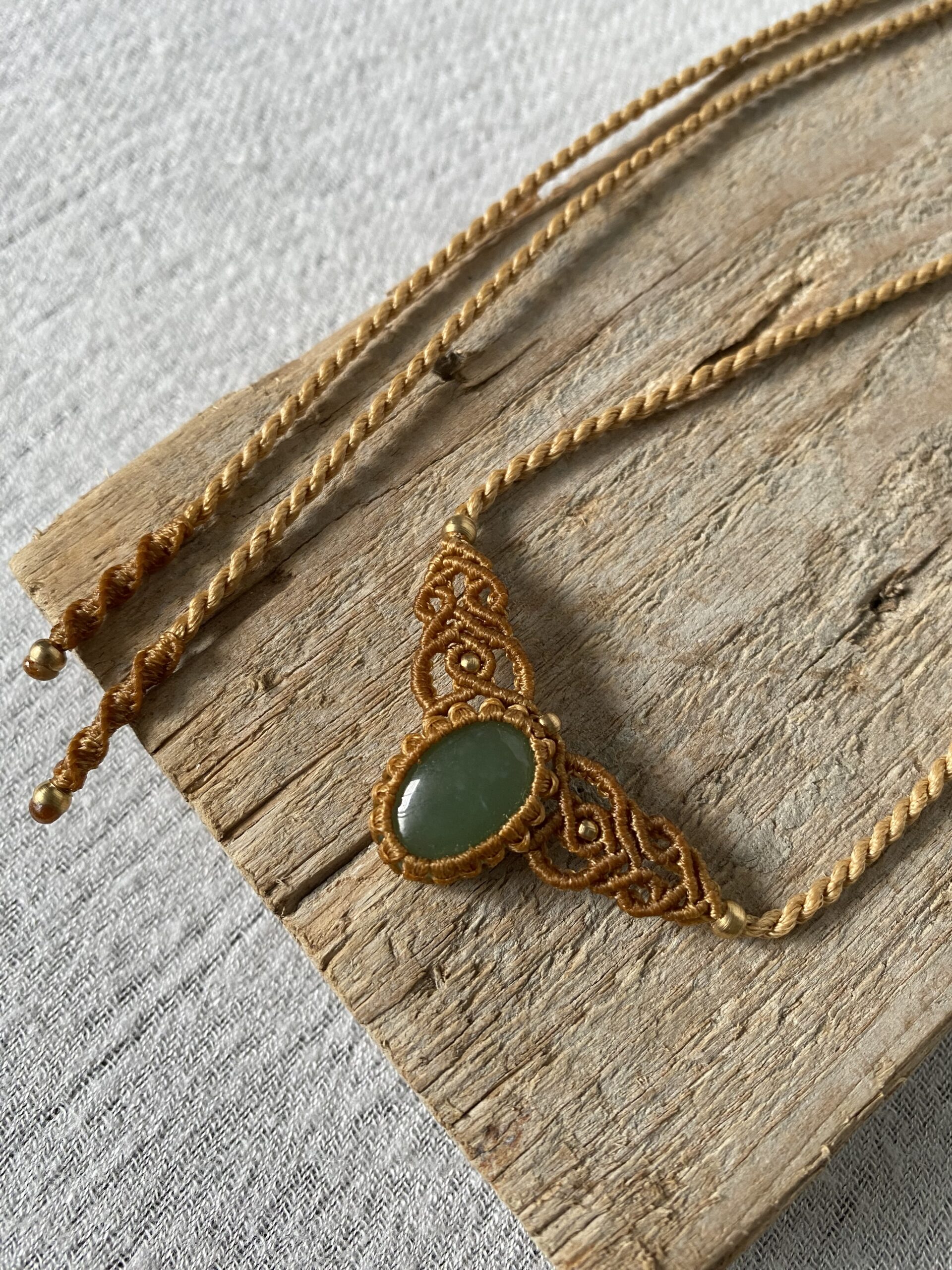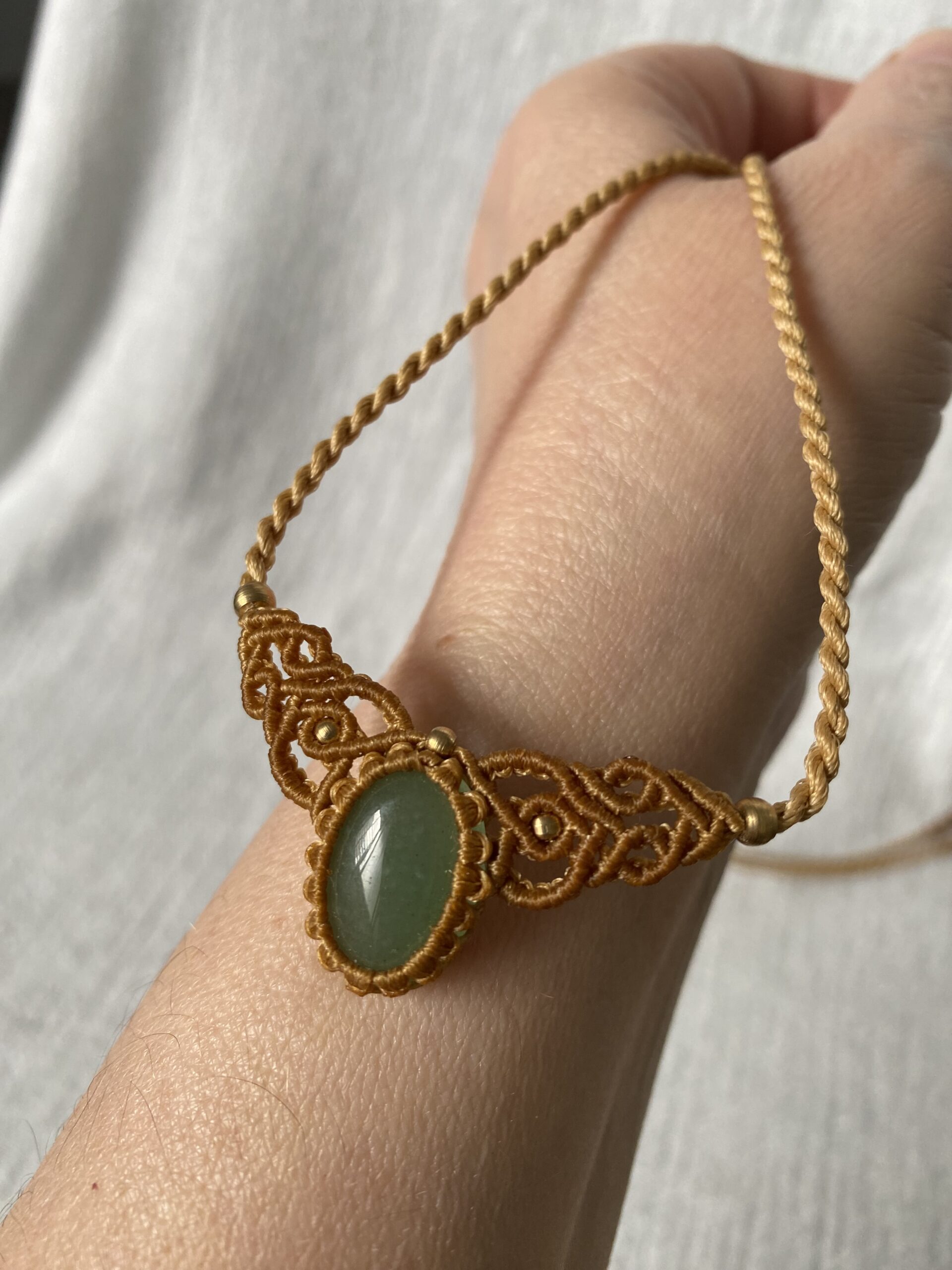 הצבע הזהוב של החוט משתלב בהרמוניה מושלמת עם הירקרקות הרכה של האבן, ויחד הם יוצרים תכשיט שמקרין שלווה, טוהר ונשיות מאוזנת.