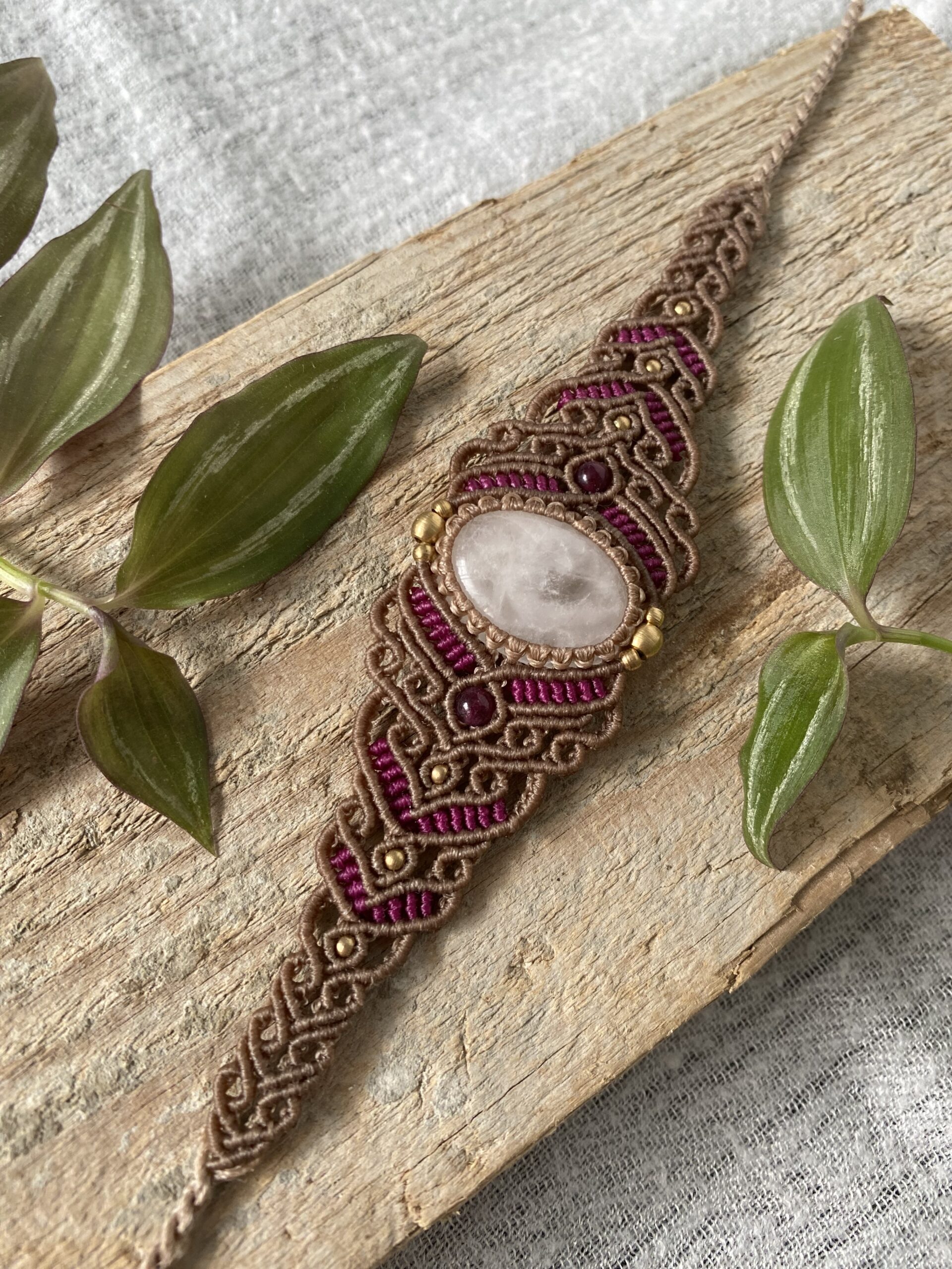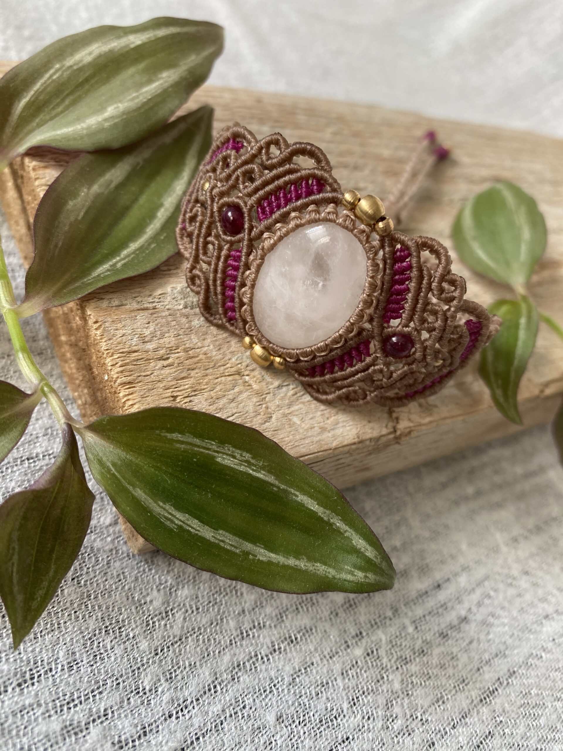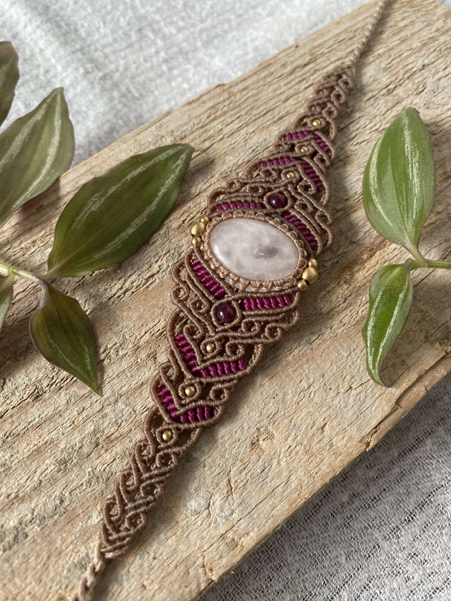 הצמיד נוצר בקשרי מקרמה מורכבים בגוון טבעי חמים, בתוספת תפרים בצבע יין עמוק המלווים את האבן ומעצימים את הנוכחות שלה. חרוזי מתכת בגוון זהב מעניקים מראה מלכותי, בוהמי ומדויק.