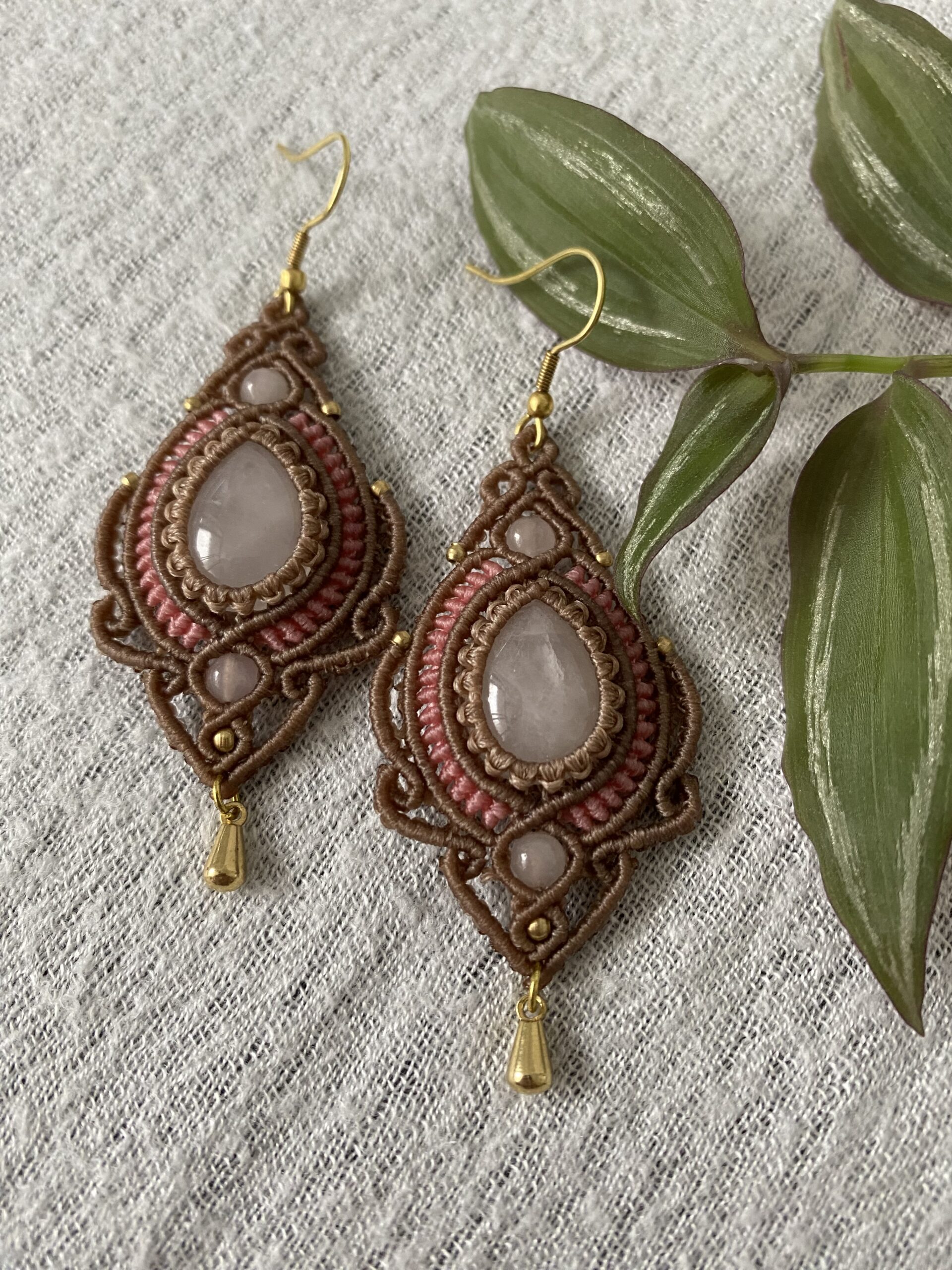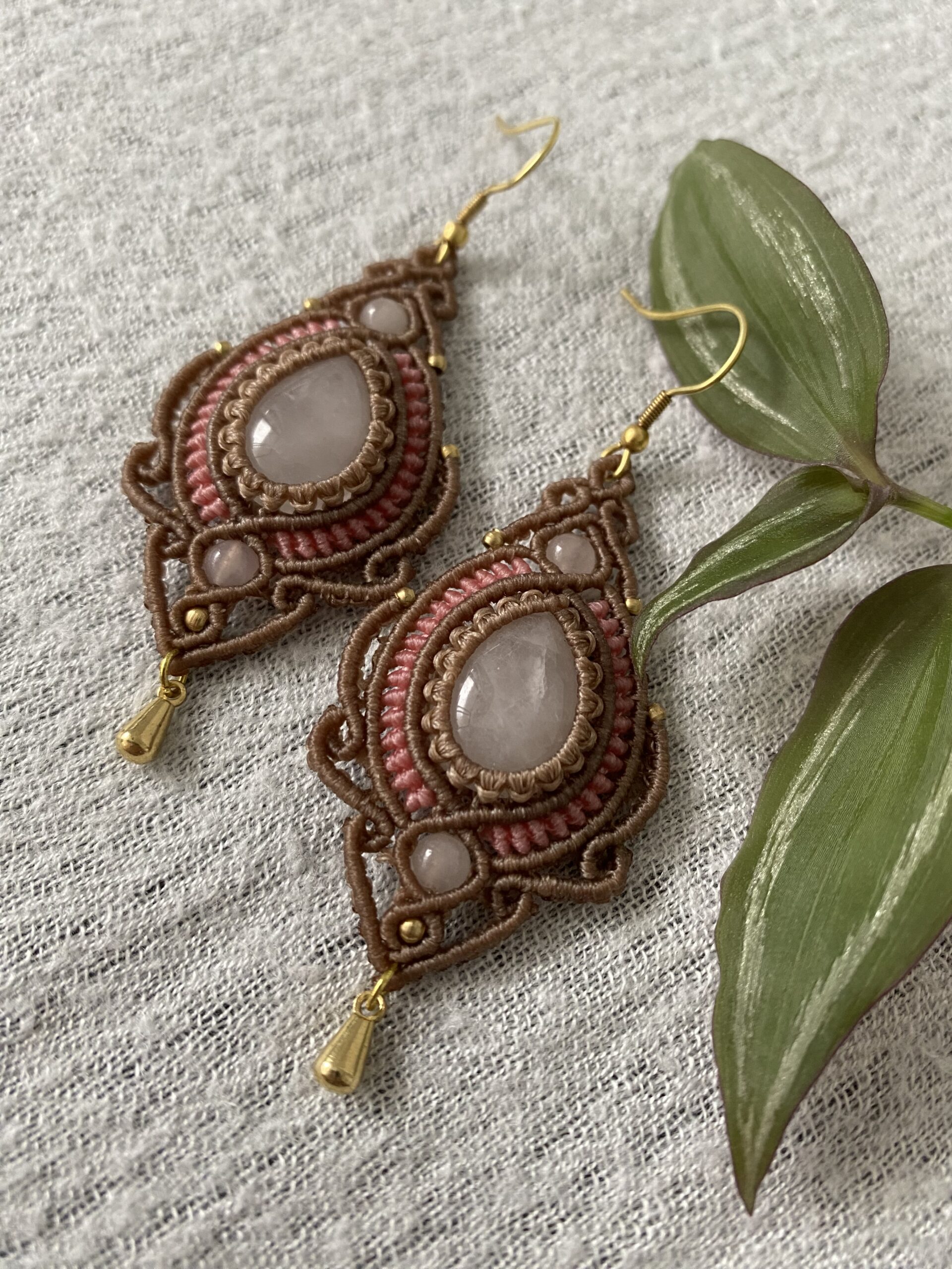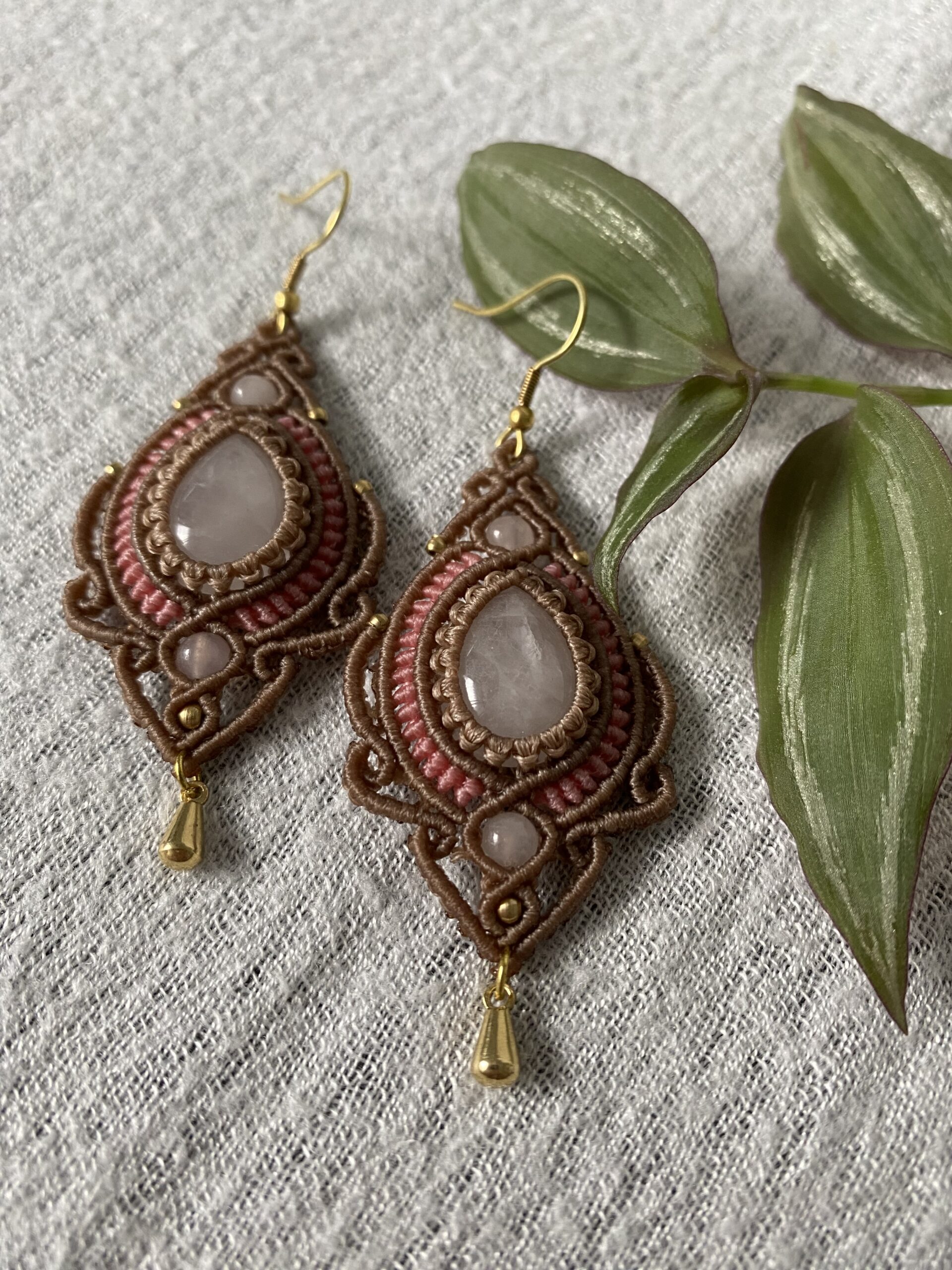 עגילי המקרמה האלה נוצרו בעבודת יד קפדנית, בשילוב רוז קוורץ טבעי בגוון ורוד רך שמעניק לתכשיט מראה עדין והרמוני. הצבעים החמים – חום, ורוד עתיק ונגיעות מוזהב – יוצרים מראה אלגנטי, נשי ומאוזן.